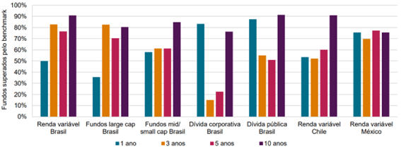 O relatório SPIVA 2025 reafirma a dificuldade da gestão ativa em superar o mercado. No Brasil, mais de 80% dos fundos de ações perdem para os benchmarks em dez anos, devido ao peso das taxas e da crescente eficiência informacional.