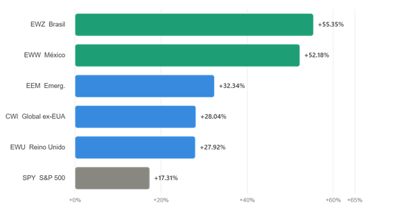 O gráfico acima mostra o retorno de alguns ETFs que oferecem exposição a outros países, como Brasil, México e Reino Unido. Conseguimos perceber o quanto outras geografias entregaram retornos superiores ao mercado americano.